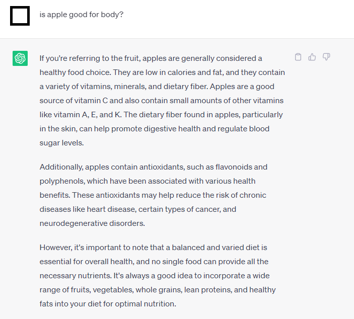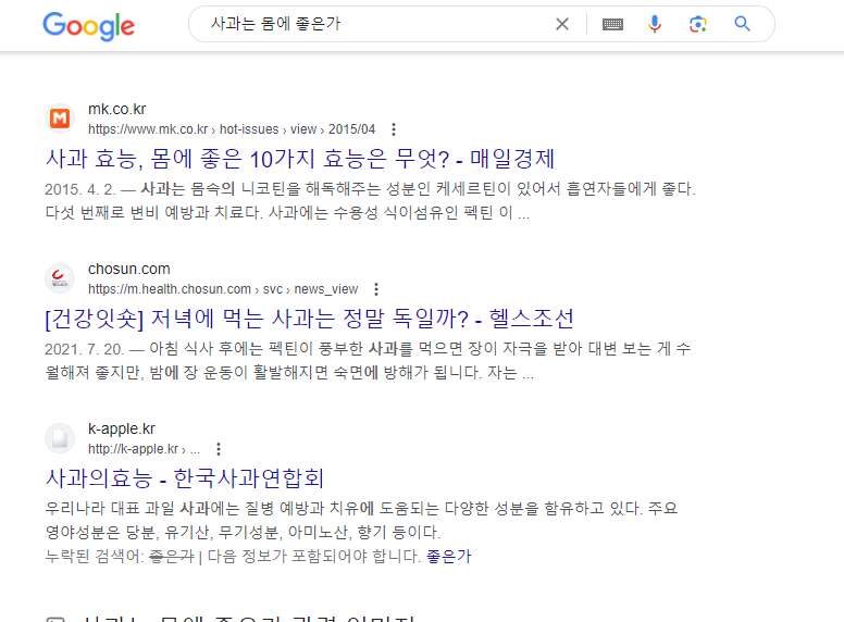 인공지능과 서치엔진에게 질문하는 것은 어떤 차이가 있을까요? 인공지능과 서치엔진에 사과는 몸에 좋은가?라고 물어보겠습니다.