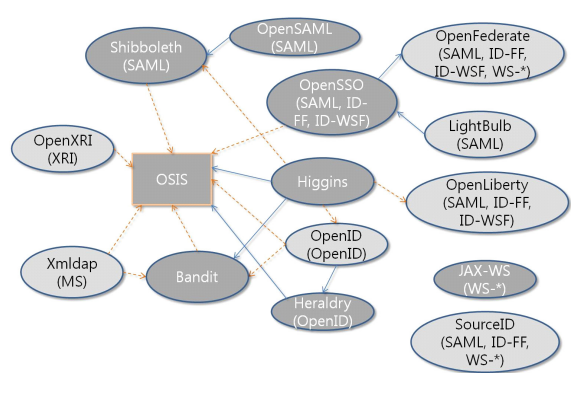 그림의 네모는 오픈소스 ID 관리 프로젝트로 표준화된 기술이고, 각각의 동그라미는 개발프로젝트들입니다.