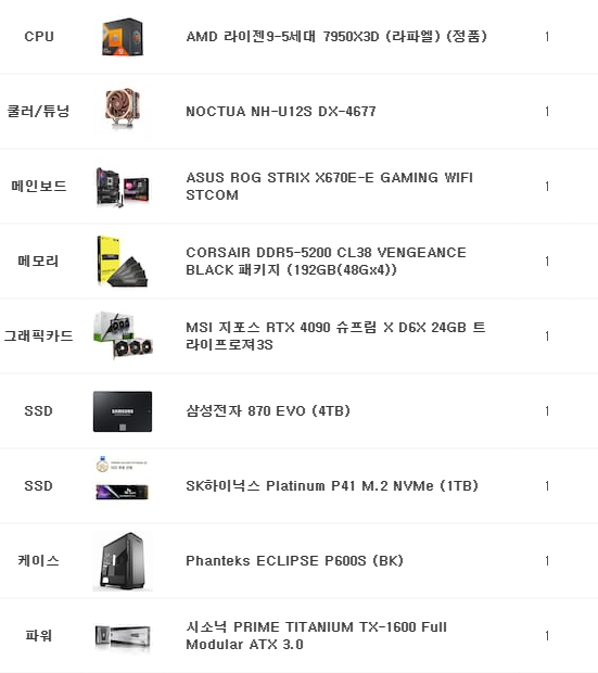 가격은 엄청 비싸긴 하지만 성능이 상대적으로 떨어지는 부품은 눈물을 머금고 제외했습니다.