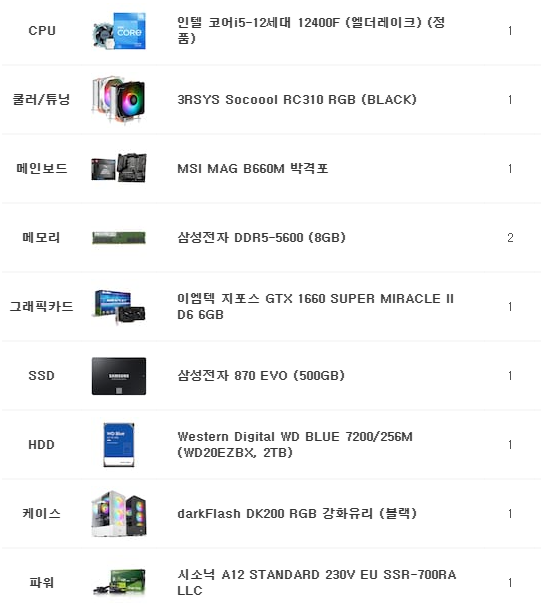 이 금액은 조립비, 택배비, 기타 비용이 제외된 부품가격이며 구입시기, 장소에 따라 다를 수 있습니다.