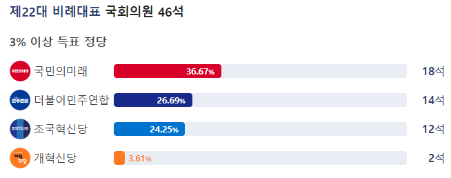 법이 정한 배분방식에따라 전체투표의 3% 이상을 득표한 정당은 비례대표 의석을 얻게 됩니다. 총 46석의 비례대표의석 중 국민의힘 위성정당인 국민의 미래가 18석을 획득했습니다. 이에 따라 국민의 힘은 야당 200석이라는 악몽에서 벗어나게 되었습니다. 왜 200석이 되는 것을 그토록 저지하고 싶었을까요? 그것은 대통령이 거부권을 발휘한 법안은 국회에서 재의결해야 하는데 이때 재적의원의 3분의 2가 찬성하게 될 경우 그 법안은 통과되게 됩니다. 즉 야당이 200석을 얻을 경우 대통령의 거부권이 무력화되기에 야당에게는 막강한 권한이 생겨나게 됩니다.