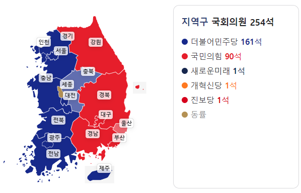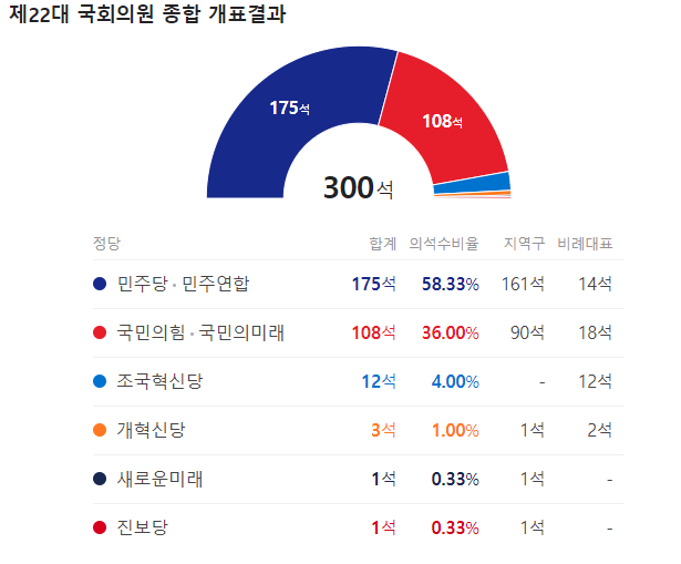 개표가 마무리되면서 더불어민주당은 300석(지역구254석+비례대표 46석)의 의석 중 과반인 150석을 넘어선 161석을 차지하면서 자체과반을 넘어서는 의석을 차지하면서 앞으로 국민의 심판을 실천하기 위한 다양한 입법과 활동을 할 것으로 보입니다. 야권의 압승이 불러올 윤석열 대통령의 레임덕(임기말 권력누수)으로 인해 국정이 더욱 혼란해질 가능성이 커지면서 심판의 성공이 행복한 결말을 가져오지 않을 수도 있을 것 같습니다.